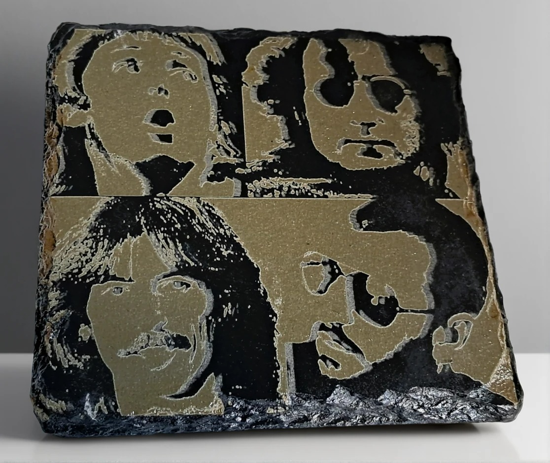 A classic and durable handcrafted square slate coaster featuring the iconic silhouettes of The Beatles surrounding their famous logo. A perfect piece of handmade rock history and an essential gift for any fan.