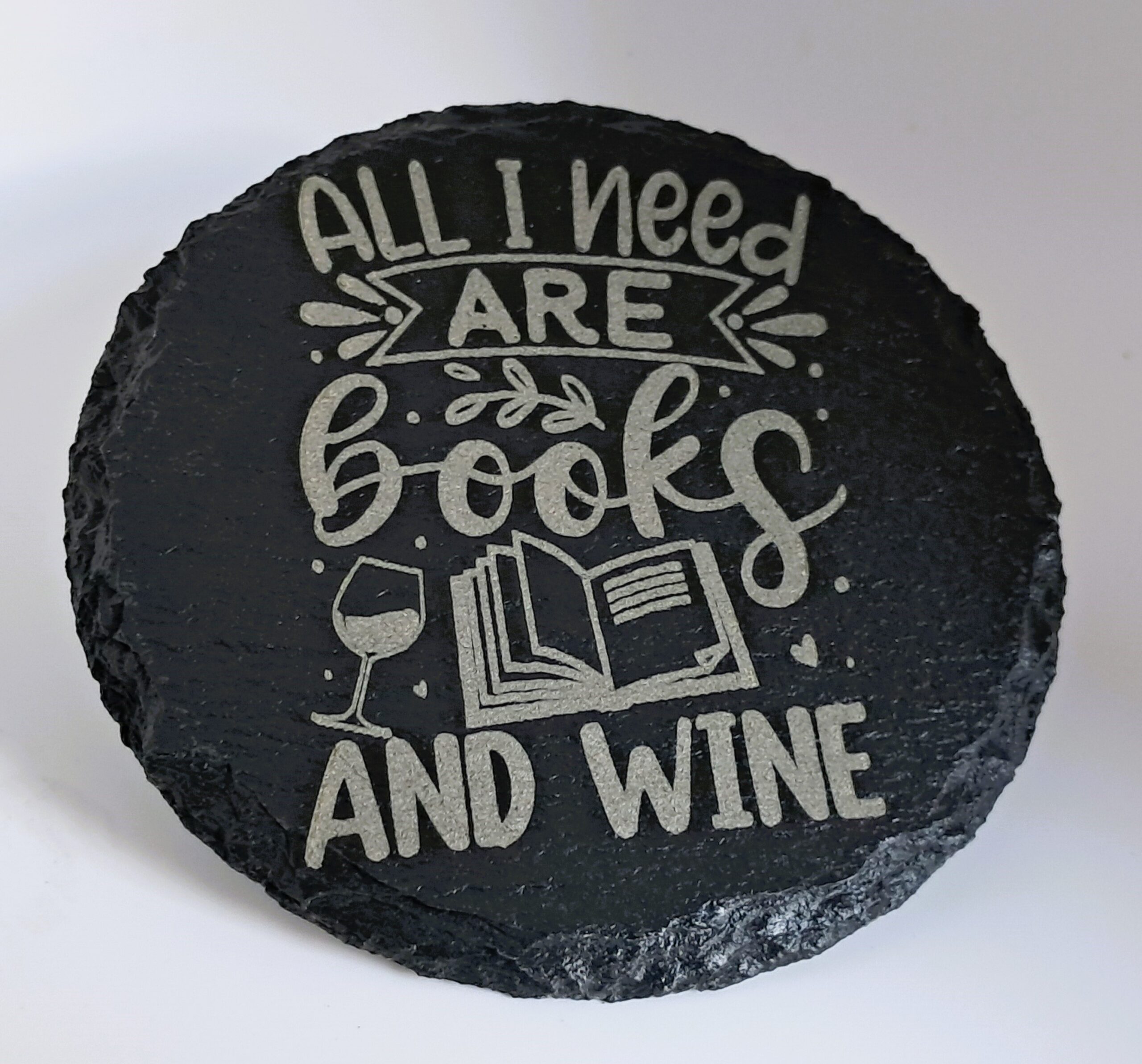 Handcrafted Slate Coaster: “All I Need Are Books and Wine” Engraved Round Drink Mat – Perfect Gift for Readers