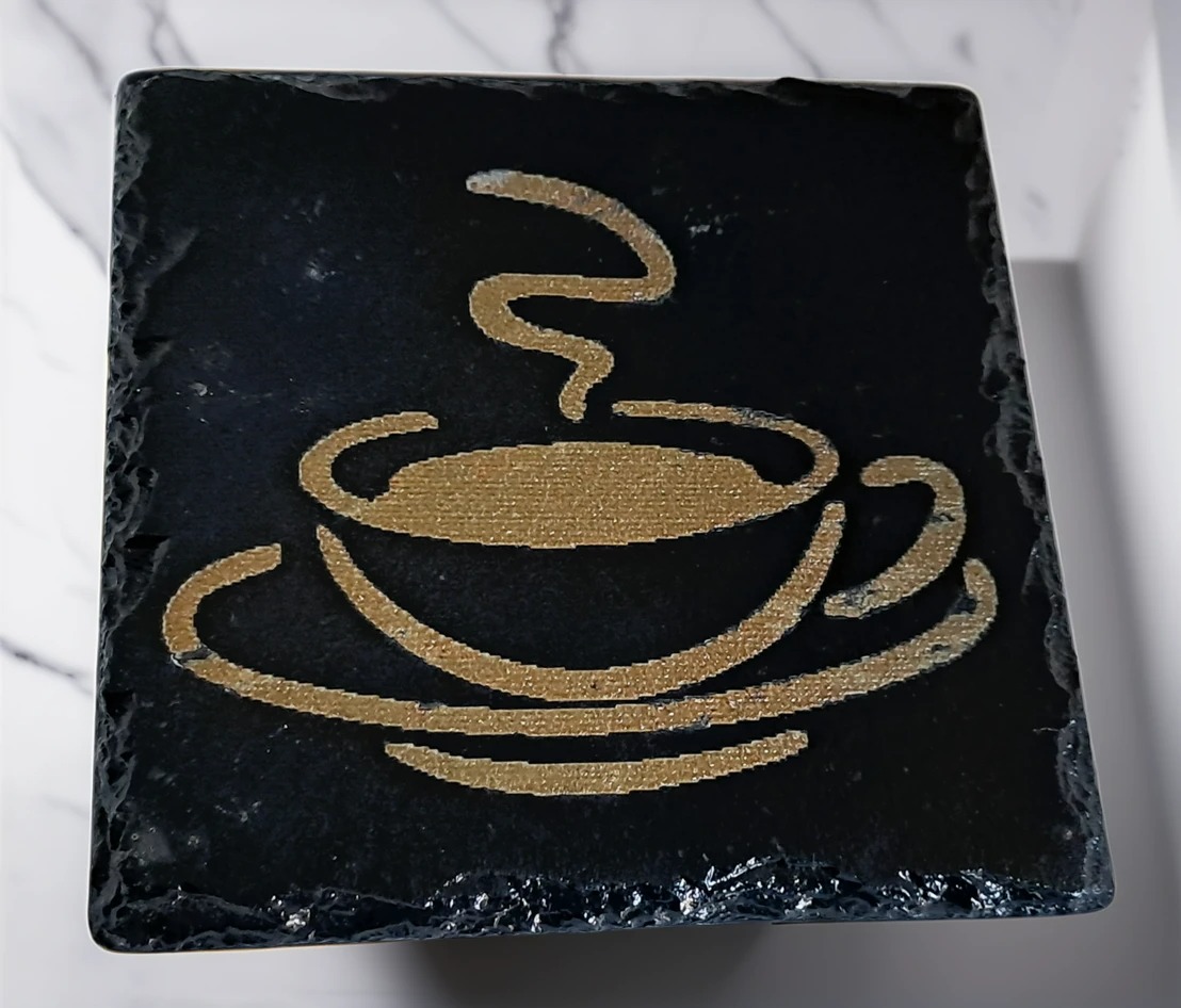 Introduce a touch of gold-toned sophistication to your home with this striking handcrafted natural slate coaster. Unlike the etched designs, this coaster features a vibrant, painted or applied gold-coloured graphic of a steaming coffee cup and saucer, making the design truly pop against the deep, rustic black slate. The natural, hand-split edges of the slate give each piece a unique, organic, and truly handcrafted feel.