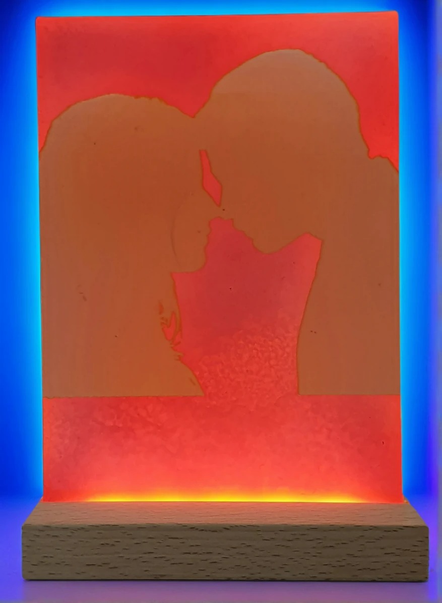 Capture the moment with this unique, expertly crafted LED light, featuring a tender silhouette of a couple kissing, etched onto A6 acrylic. It’s powered via a USB connection to a beautiful wooden base, making it a perfect, handmade symbol of romance and affection.