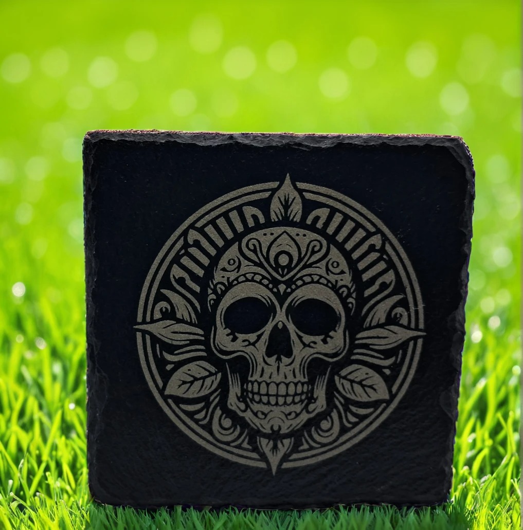 Handcrafted from natural, durable slate, this engraved coaster is a striking blend of rustic material and intricate detail. The design showcases a highly detailed, stylized skull—reminiscent of Sugar Skull or Day of the Dead folk art—framed by a decorative circular motif and elegant leaves. The high-contrast etching beautifully highlights the delicate patterns and striking symmetry of the artwork. This handcrafted slate item is a robust and eye-catching piece of functional decor, perfect for adding a touch of bold, artistic flair to a coffee table, bar, or desk. It makes a thoughtful and unusual gift for anyone who appreciates Gothic, bohemian, or stylized skull imagery in their home items made from slate.