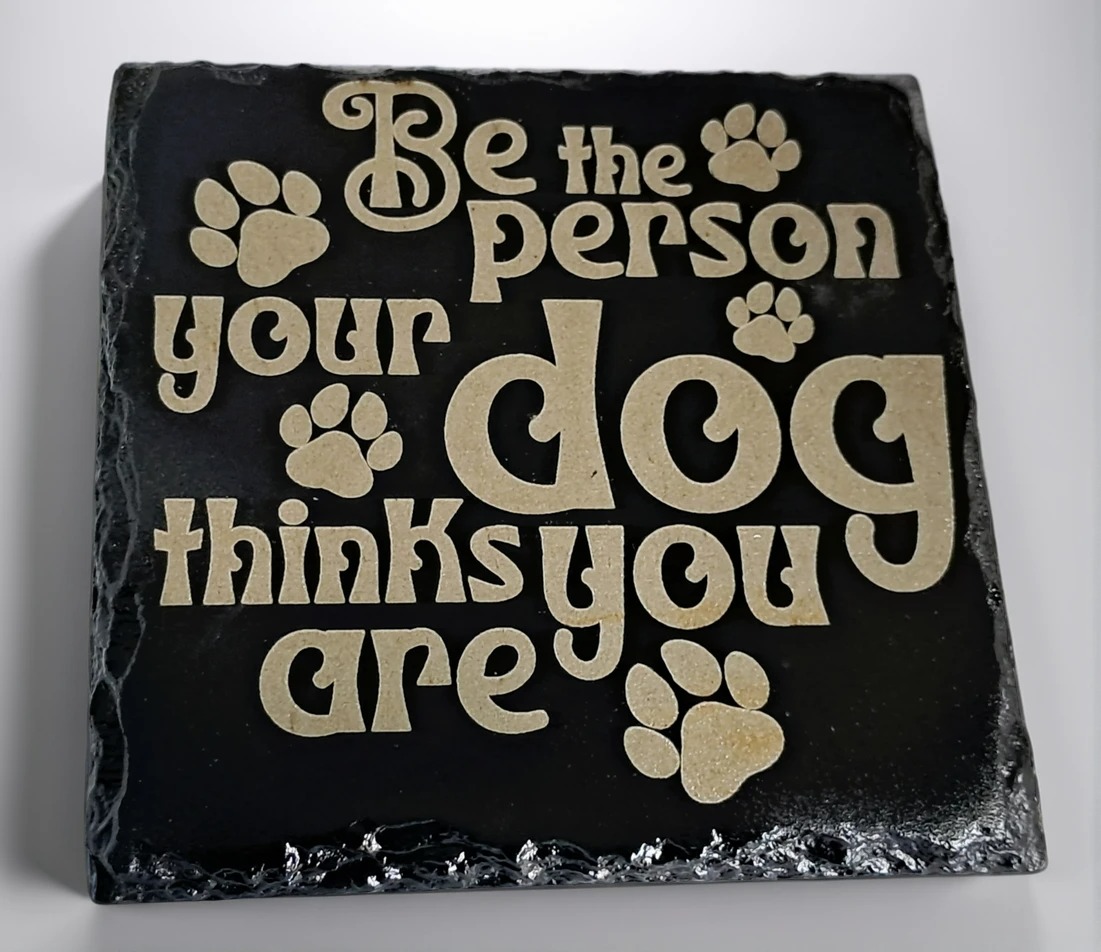 Handcrafted Slate Coaster: “Be The Person Your Dog Thinks You Are” Engraved Square Drink Mat – Inspirational Dog GiftDog Lover Slate Coaster