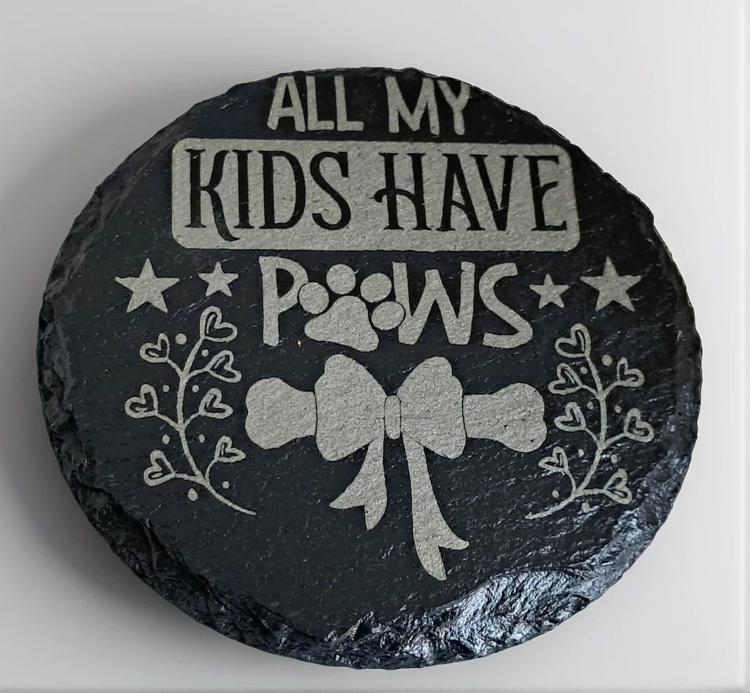 Handcrafted Slate Coaster: “All My Kids Have Paws” Engraved Round Drink Mat – Dog & Cat Mum Gift