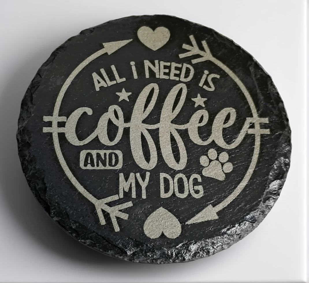 Handcrafted Slate Coaster: “All I Need Is Coffee and My Dog” Engraved Round Drink Mat – Pet Mum Gift