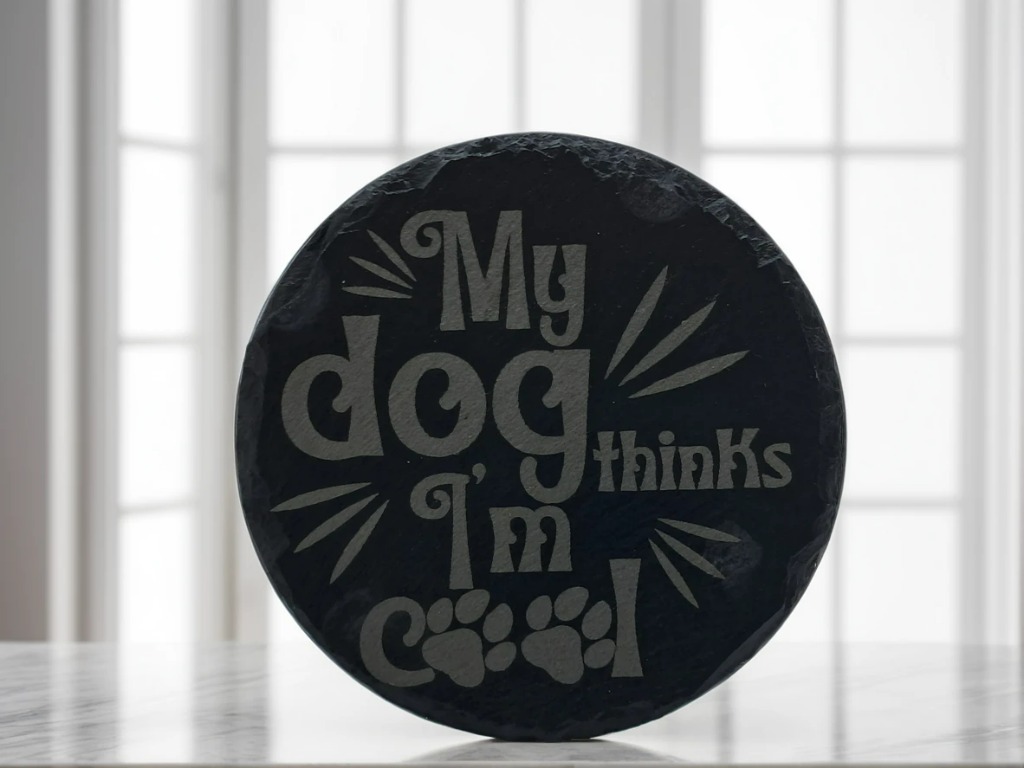 Handmade “My Dog Thinks I’m Cool” Round Slate Coaster – Funny Engraved Dog Lover Gift