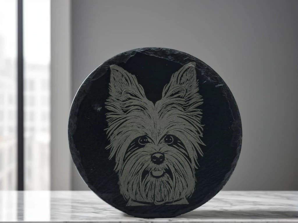 Showcase your love for the delightful Yorkshire Terrier with this elegant and distinctive handmade slate coaster. Each piece of natural, round slate is carefully prepared and then precisely laser-engraved with a lifelike portrait of a Yorkie, capturing its characteristic lively expression and shaggy coat.
