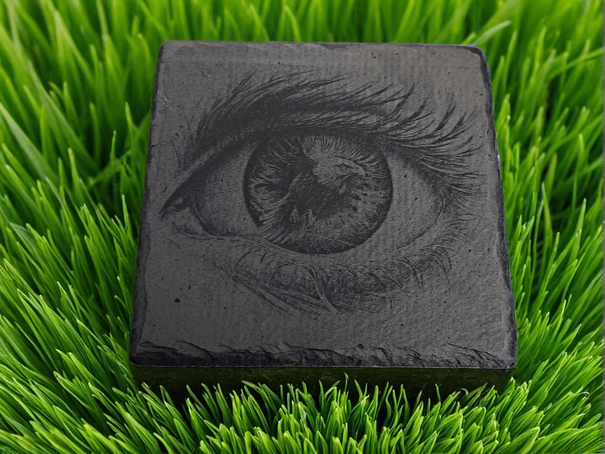 Handcrafted from natural, durable slate, this engraved coaster is a striking display of intricate detail and realism. The design focuses on a highly realistic depiction of an eye, capturing the fine texture of the lashes, iris, and pupil with remarkable precision. The high-contrast etching against the dark slate creates a dramatic and almost hypnotic effect. This handcrafted slate item is a sophisticated and subtle piece of functional decor, ideal for adding a sense of mystery and depth to a desk, studio, or living room. It makes an excellent and unique gift for artists, photographers, or anyone who appreciates finely detailed, evocative art made from slate.