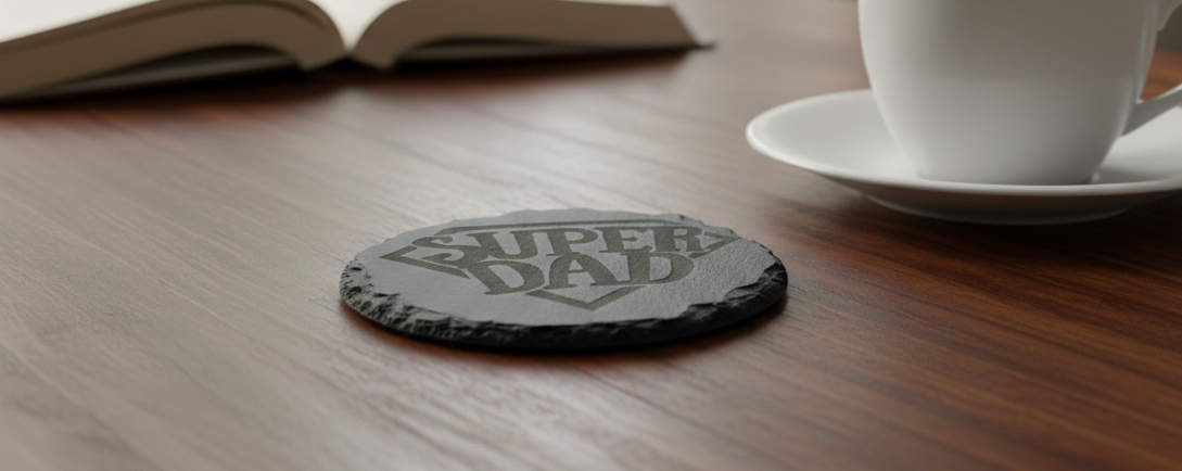 Handcrafted “Super Dad” Laser-Engraved Circular Slate Coaster
