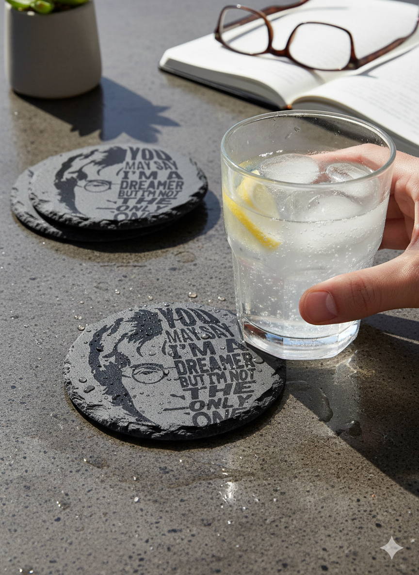 The coaster features a beautifully detailed portrait of John Lennon alongside his timeless quote from the song “Imagine,” which is deep-engraved into the slate surface. This permanent etching ensures a crisp design that will never fade or wear off. The natural, rough-cut edges of the round slate add an authentic, rustic feel that complements the classic musical theme.