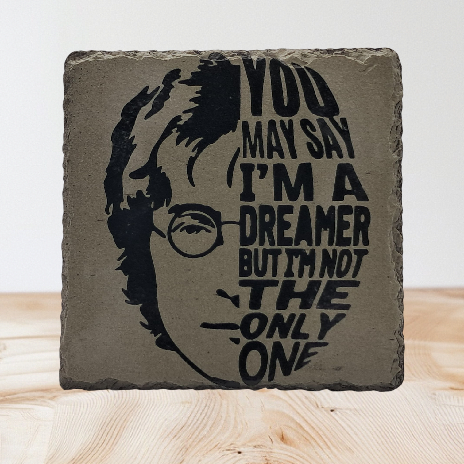 A unique piece of music memorabilia! This square, handmade slate coaster features a striking engraved portrait of John Lennon combined with his iconic lyric: “You may say I’m a dreamer but I’m not the only one” from the song Imagine. A perfect handcrafted gift for any classic rock fan or music memorabilia ! This square, handmade slate coaster features a striking engraved portrait of John Lennon combined with his iconic lyric: “You may say I’m a dreamer but I’m not the only one” from the song Imagine. A perfect handcrafted gift for any classic rock fan or music mum.