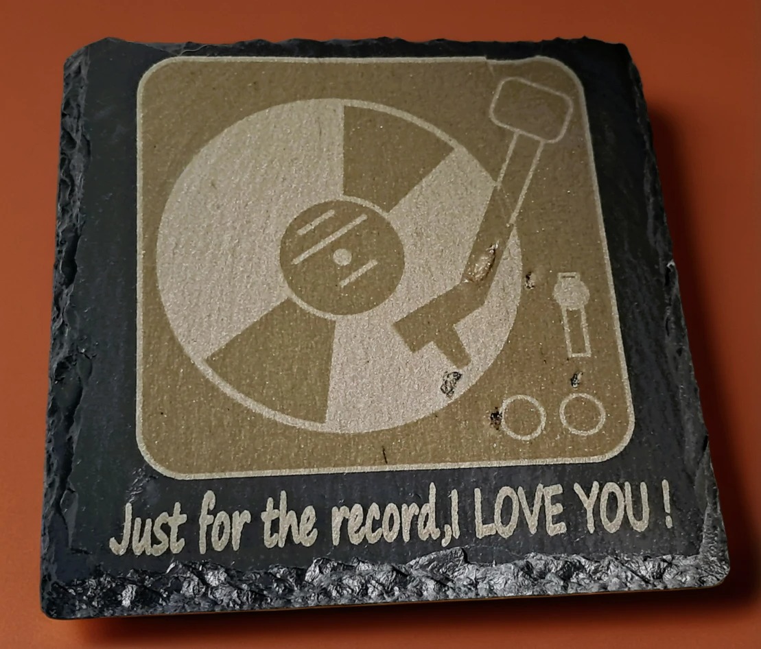 Spin the message of love every day with this striking handcrafted engraved slate coaster. The design features a charming, engraved illustration of a classic record player (turntable) in action, appealing to vintage and vinyl lovers alike. Below the graphic, the affectionate quote “Just for the record, I LOVE YOU!” is etched, making it a unique combination of music and romance.