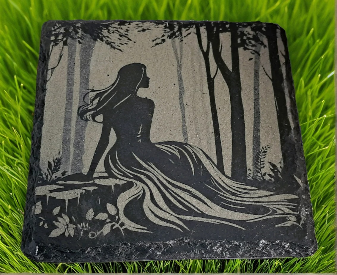 Handcrafted with precision, this beautiful slate coaster captures the tranquil elegance of the woods. The design features a stunning silhouette of a forest maiden with flowing hair and a long dress, sitting peacefully within a detailed forest scene. The delicate etching contrasts beautifully with the rustic, natural surface of the slate, making it a unique and eye-catching piece. This handcrafted slate item is not just for protecting surfaces—it’s a mini piece of functional art, ideal for a coffee table, bedside stand, or office desk. It makes a thoughtful, high-quality gift for collectors of fantasy art, woodland themes, or unique handcrafted home items made from slate.