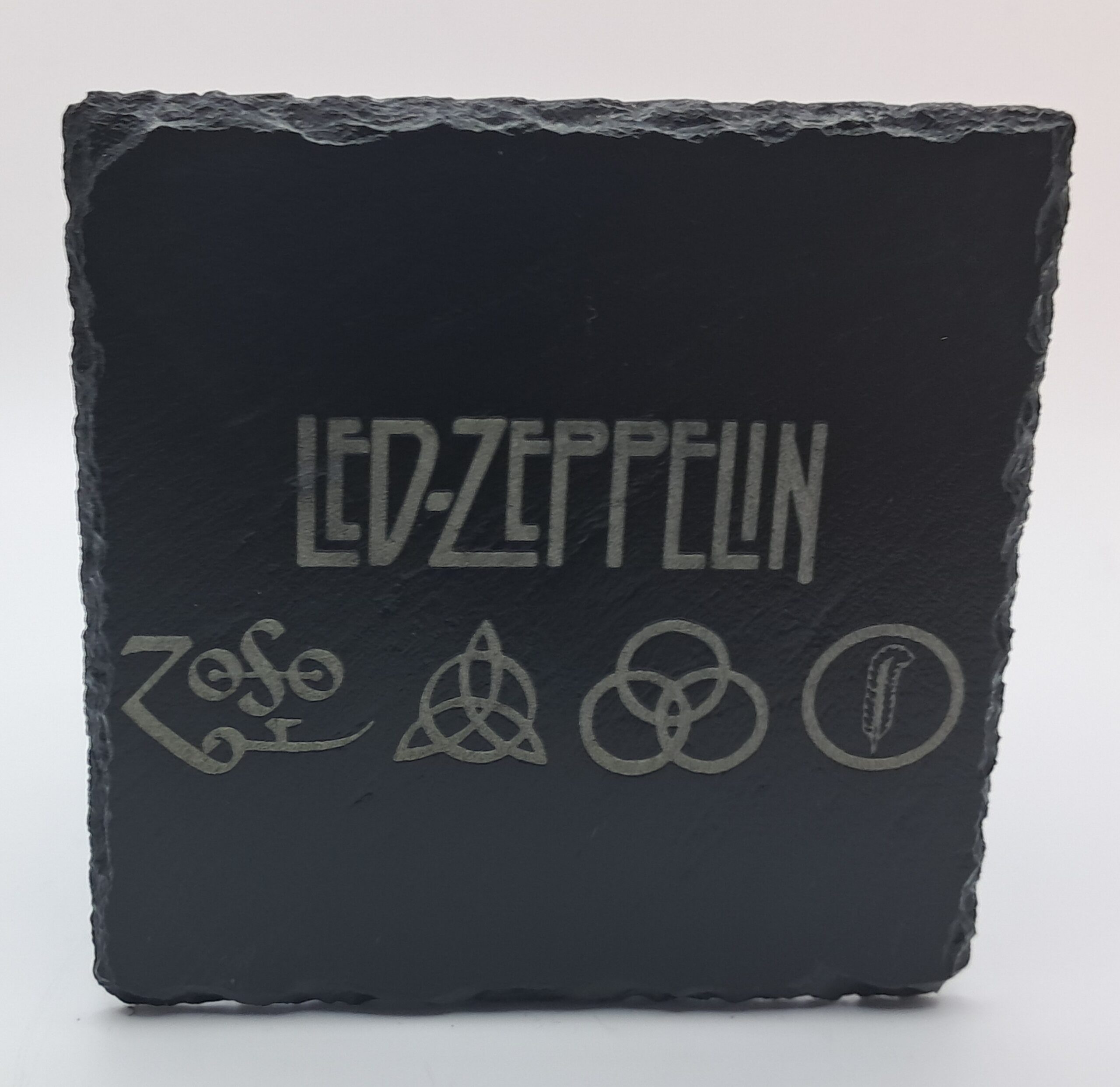 Stairway to heaven for your drinks! This square, handmade slate coaster features the band name “LED ZEPPELIN” alongside the iconic four runic symbols (Zoso) from their fourth album. A durable, mysterious, and unique handcrafted piece—the perfect tribute for any classic rock fan.