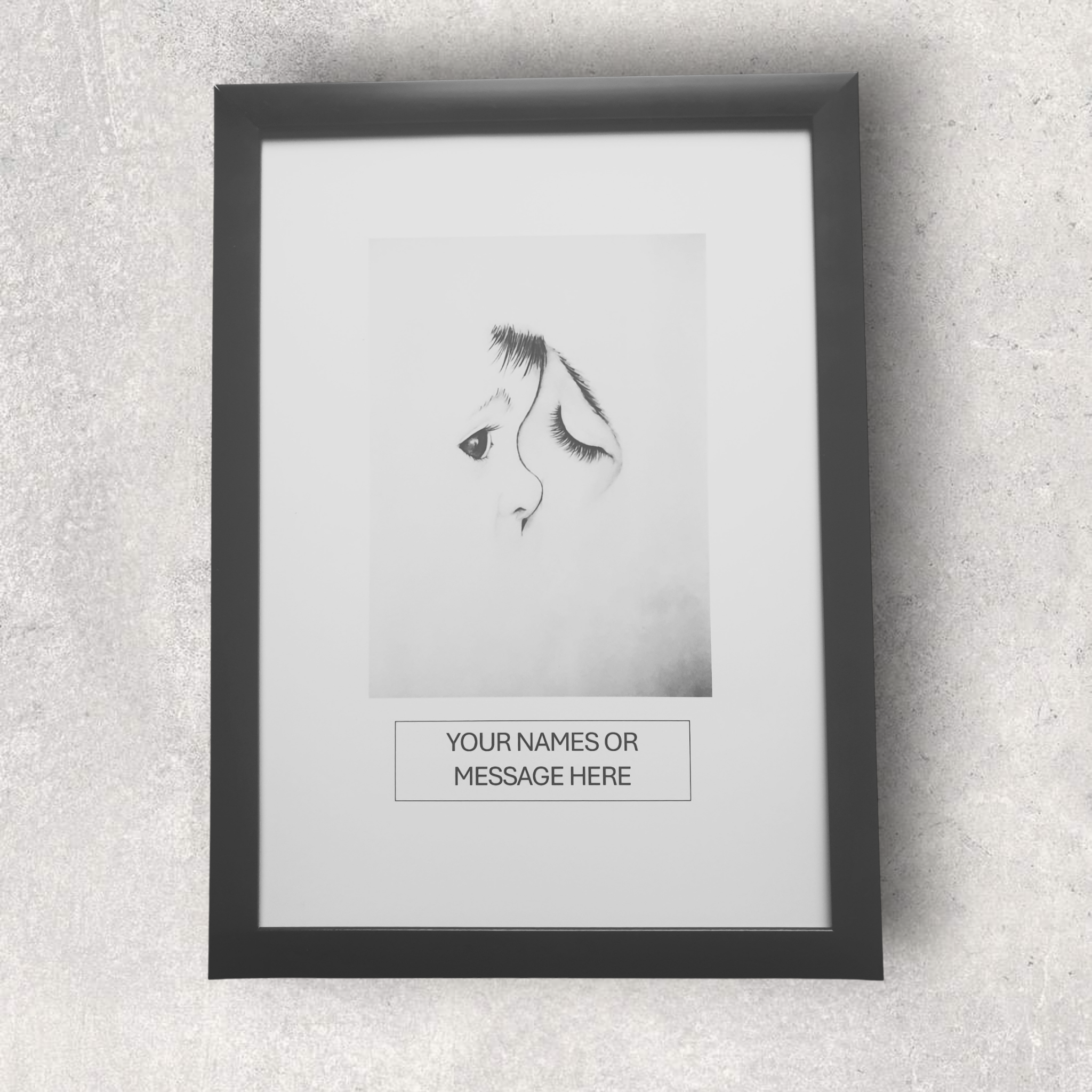 A beautifully printed A4 design featuring an elegant line drawing and a space for your custom names or message. Presented in a sleek black frame, this is a unique, personalized gift or timeless piece of decor.