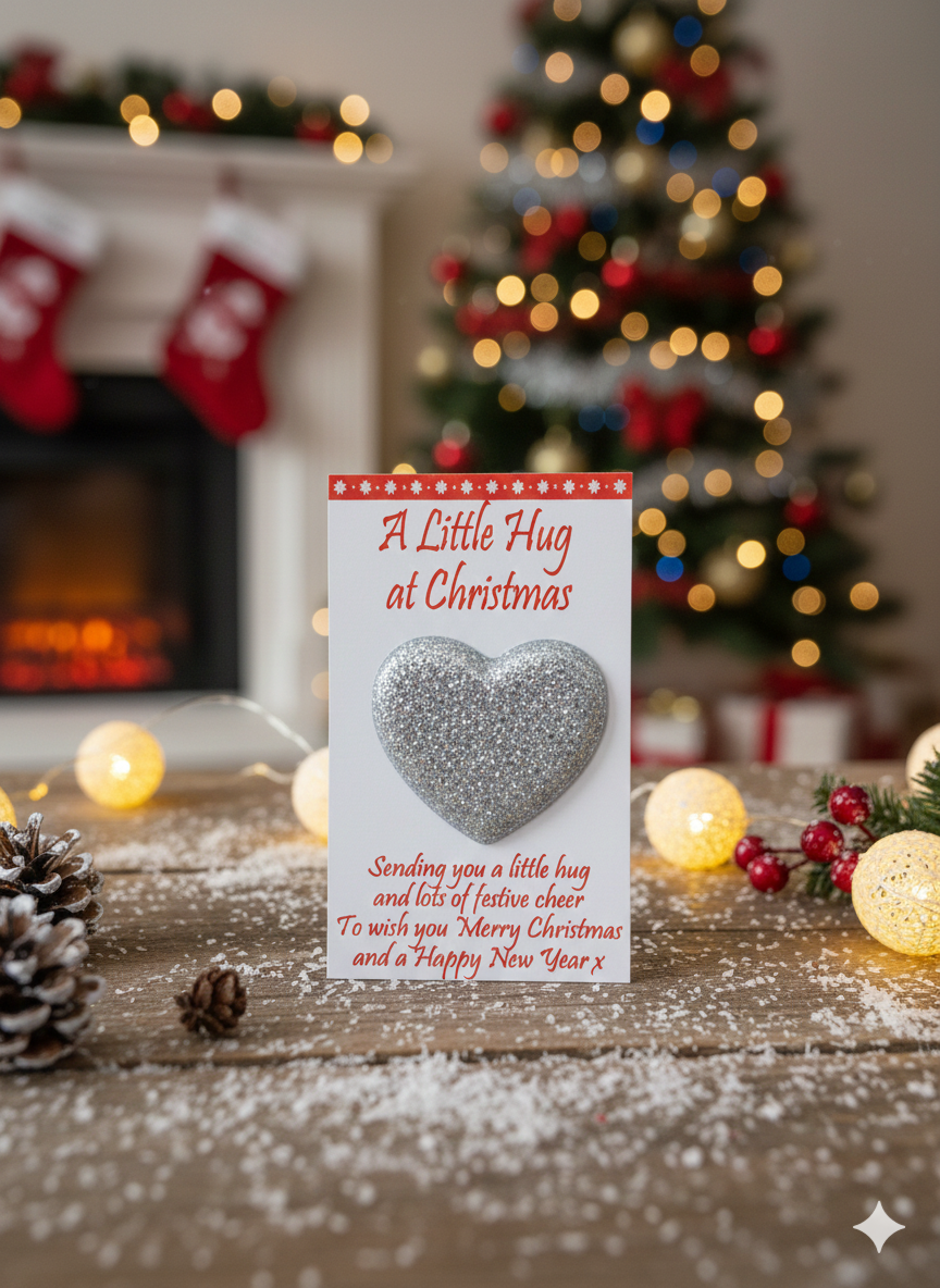 Attached to the card is a stunning handcrafted glitter heart token, designed to be a tangible little hug that the recipient can keep in their pocket, purse, or display at home. This is the perfect meaningful gift to send to a dear friend, relative, or your mum when you want them to know you are thinking of them during the holidays.