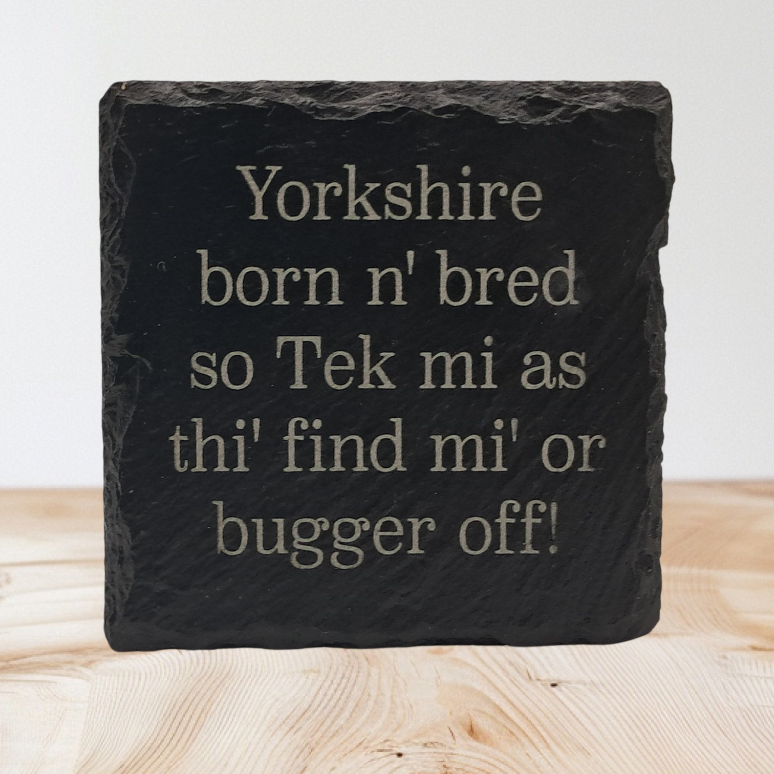 Show off some serious Yorkshire spirit with this witty handmade slate coaster, featuring the bold and traditional phrase: “Yorkshire born n’ bred so Tek mi as thi’ find mi’ or bugger off!”