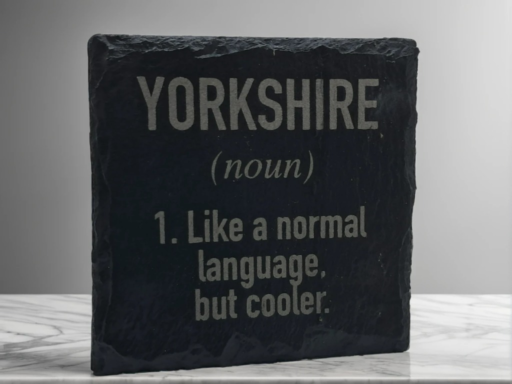 Show your love for the dialect with this handcrafted slate coaster featuring the hilarious definition: “YORKSHIRE (noun) 1. Like a normal language, but cooler.” Permanently laser-engraved onto natural slate, this unique coaster is an ideal, funny, and durable gift for anyone who speaks (or loves) the distinctive Yorkshire ‘language’.