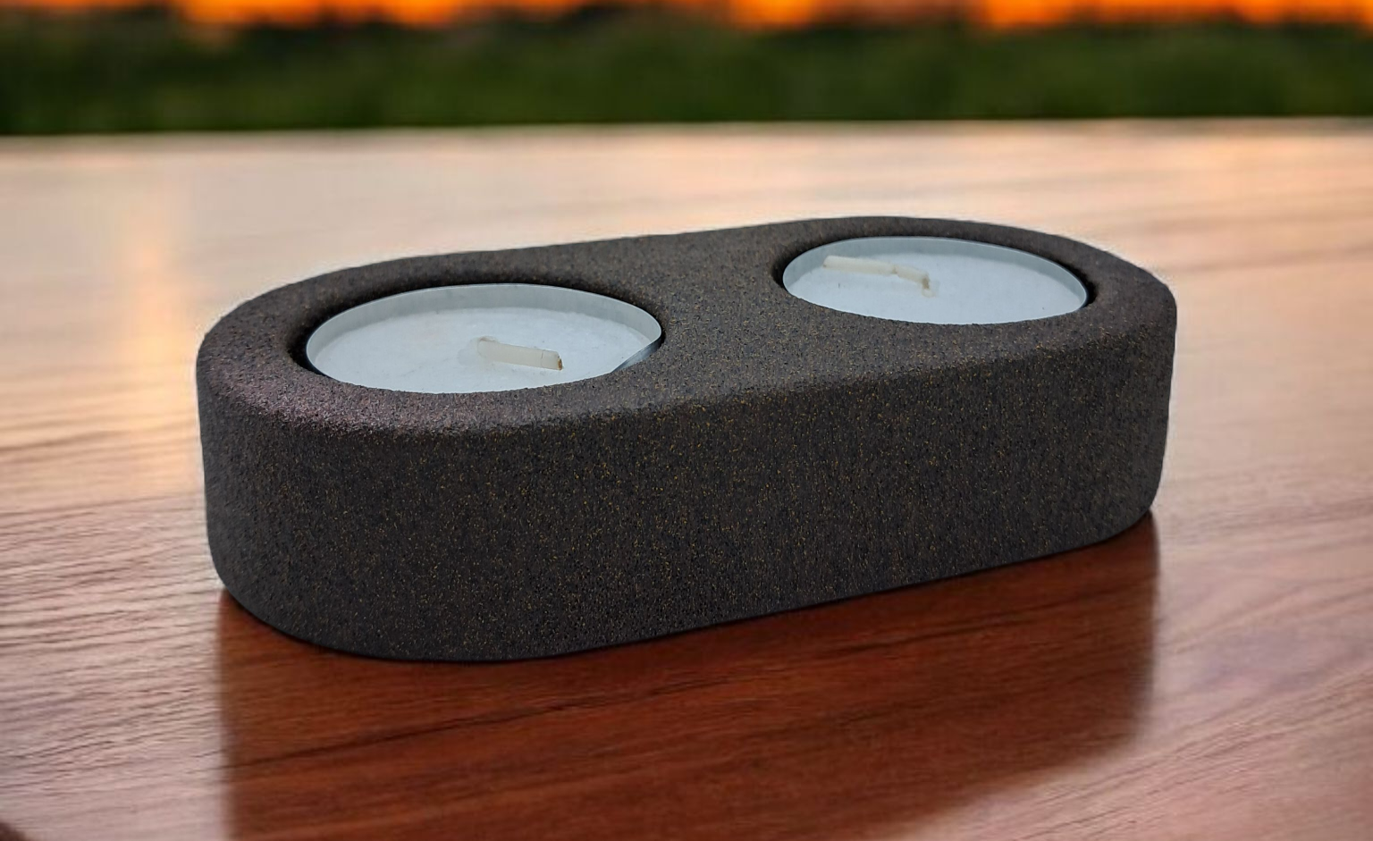 A distinctive, oval-shaped handcrafted holder designed for two tealight candles, made using textured, dark eco resin. Its grounded, minimalist aesthetic and dual flame design are perfect for creating a dramatic, warm centrepiece or a focused glow on a windowsill.