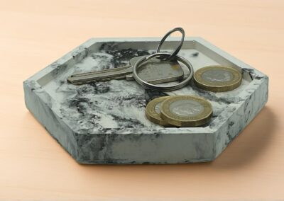Marbled Beauty Geometric Style, Artisan Crafted! This handmade hexagonal trinket tray features a striking black and white marble swirl, perfect for keys, coins, or jewellery. Its modern shape makes it a stylish and versatile catchall for any space.