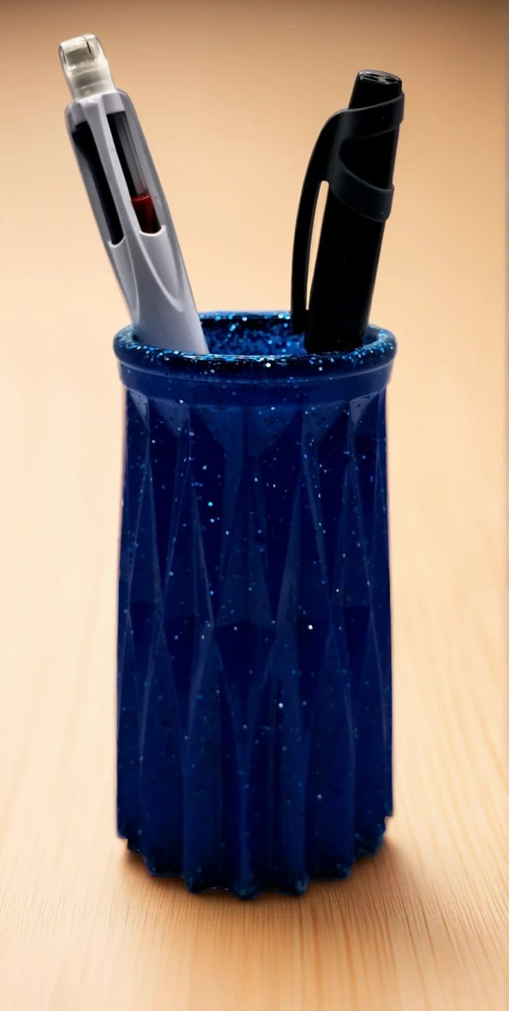 This striking, handcrafted deep blue resin pen holder features a faceted design sprinkled with sparkling glitter. Perfect for bringing a unique and functional pop of colour to your office desk, vanity, or creative workspace. A beautiful way to keep pens, brushes, or tools tidy and easily accessible.