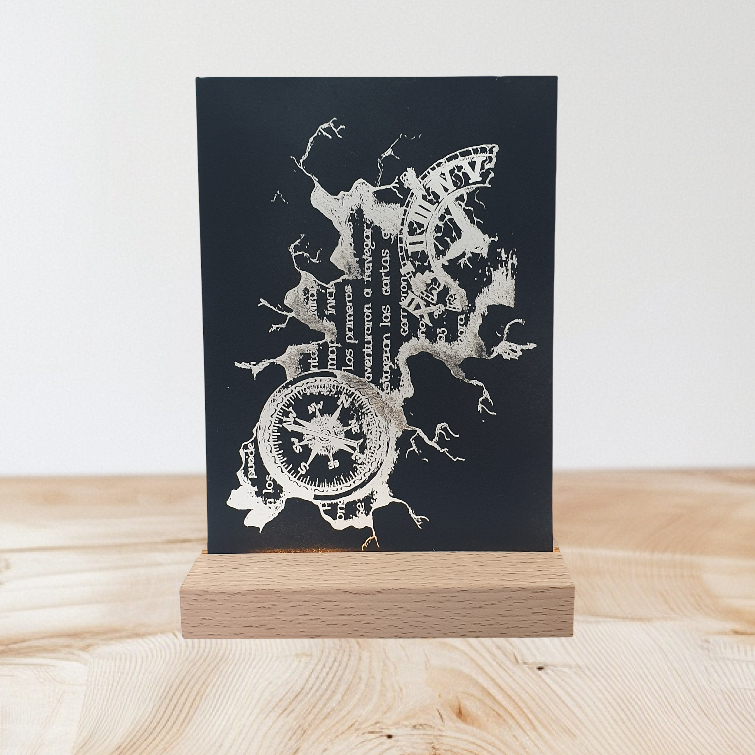 Embark on adventure with this unique, expertly crafted LED light, featuring a detailed compass and a cracked clock face entwined with old text, intricately etched onto A6 acrylic. It’s powered via a USB connection to a beautiful wooden base, perfect for adding a vintage, handmade wanderlust touch to any space.