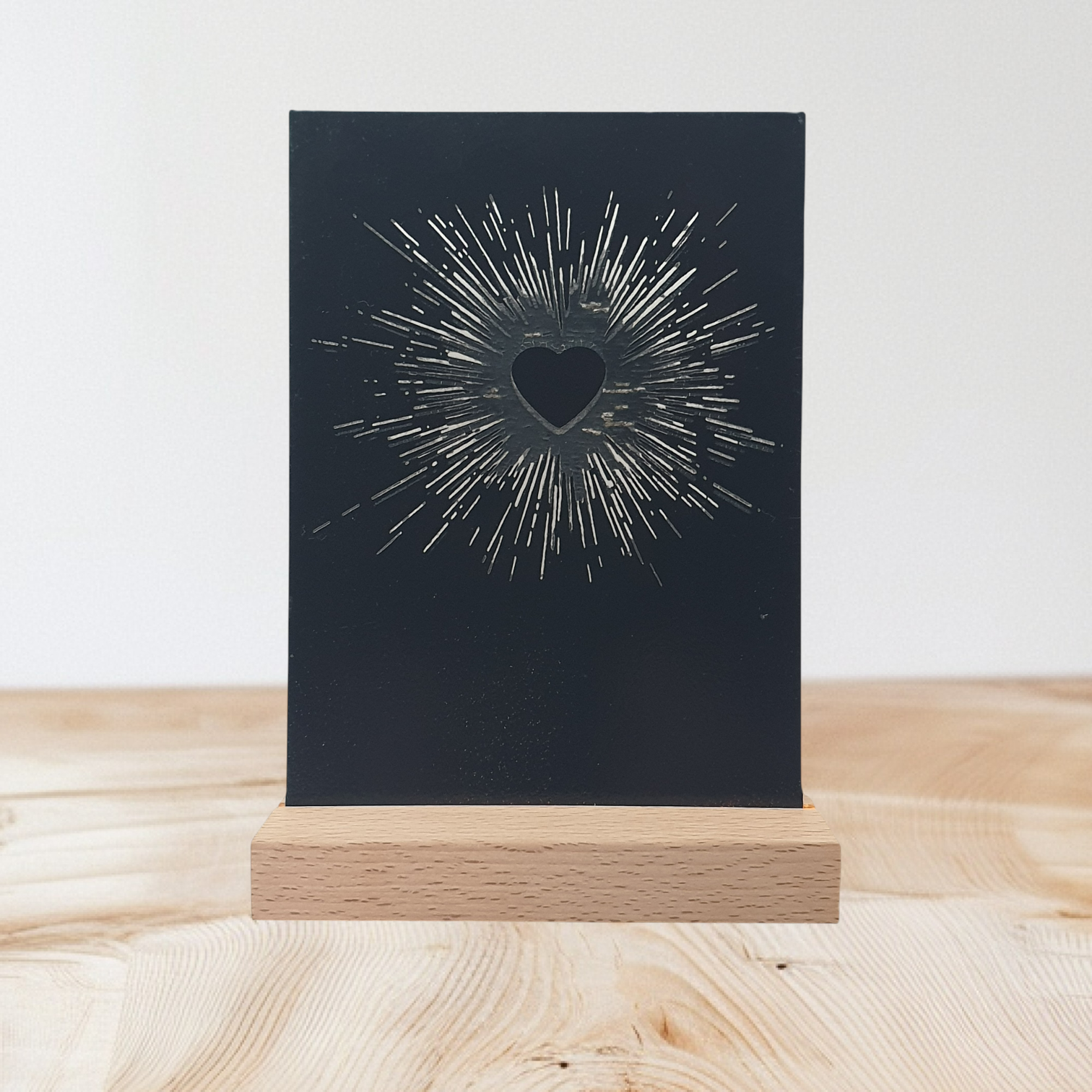 Ignite your decor with this unique, expertly crafted LED light, featuring a radiant heart with bursting rays, intricately etched onto A6 acrylic. It’s powered via a USB connection to a beautiful wooden base, perfect for adding a passionate, handmade touch to any space.