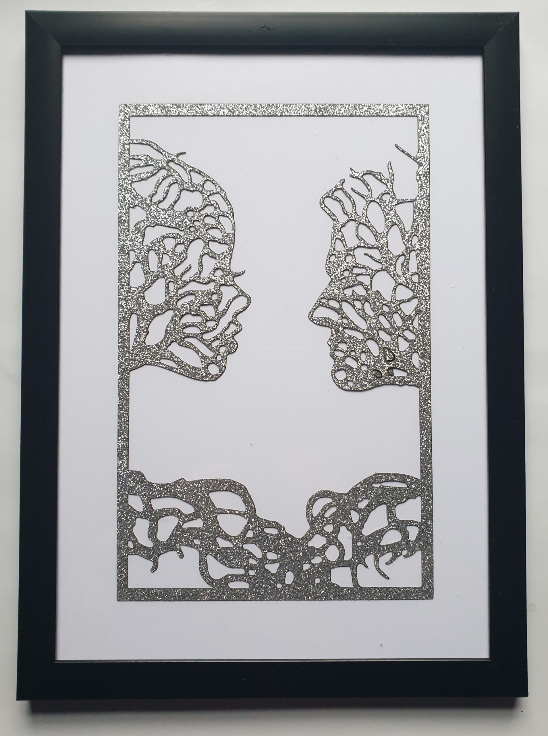 Hand-cut glitter art depicting two faces, forever gazing into one another. A unique piece adding a touch of sparkle to any space.