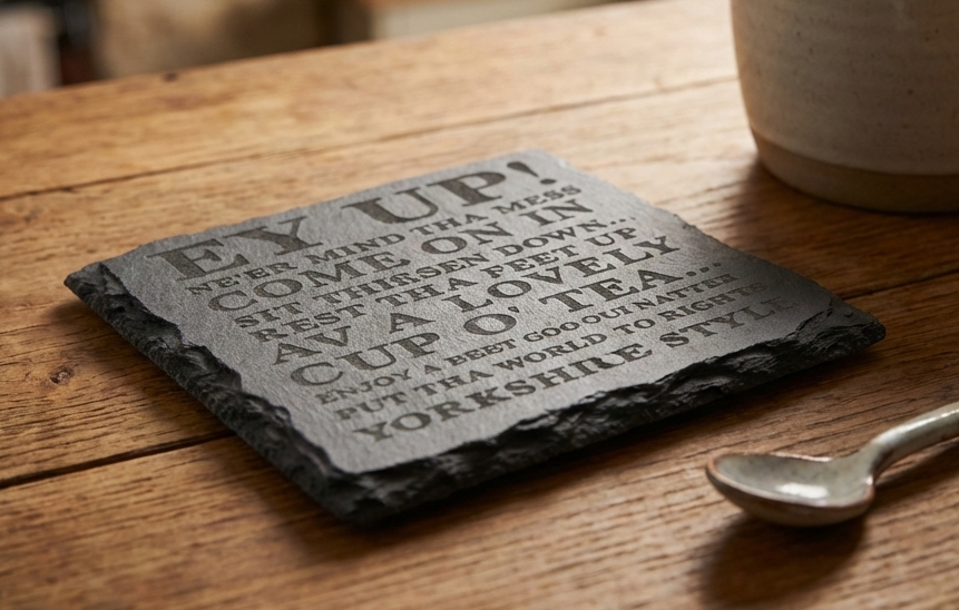 Handcrafted “Ey Up” Yorkshire Style Engraved Slate Coaster