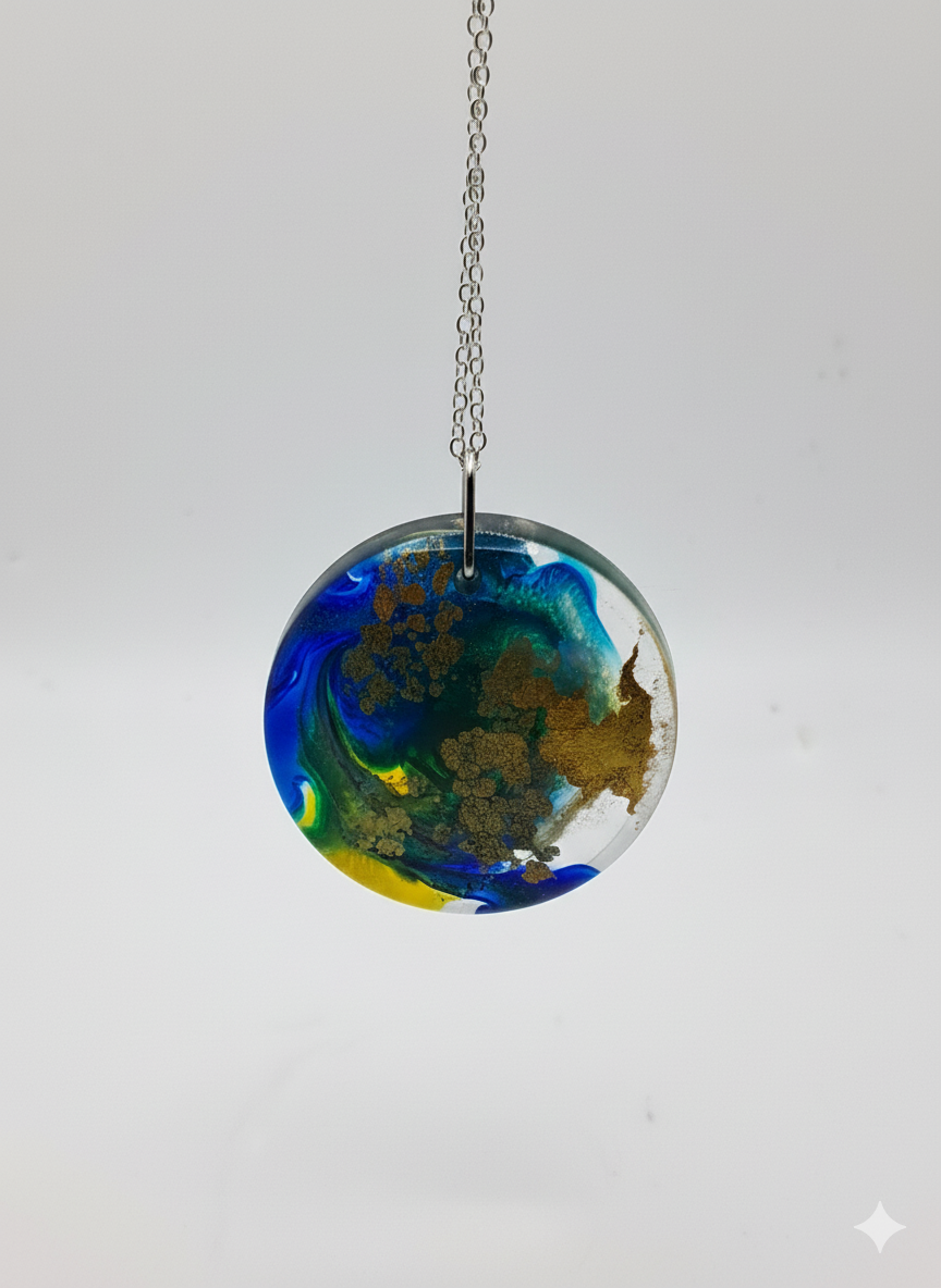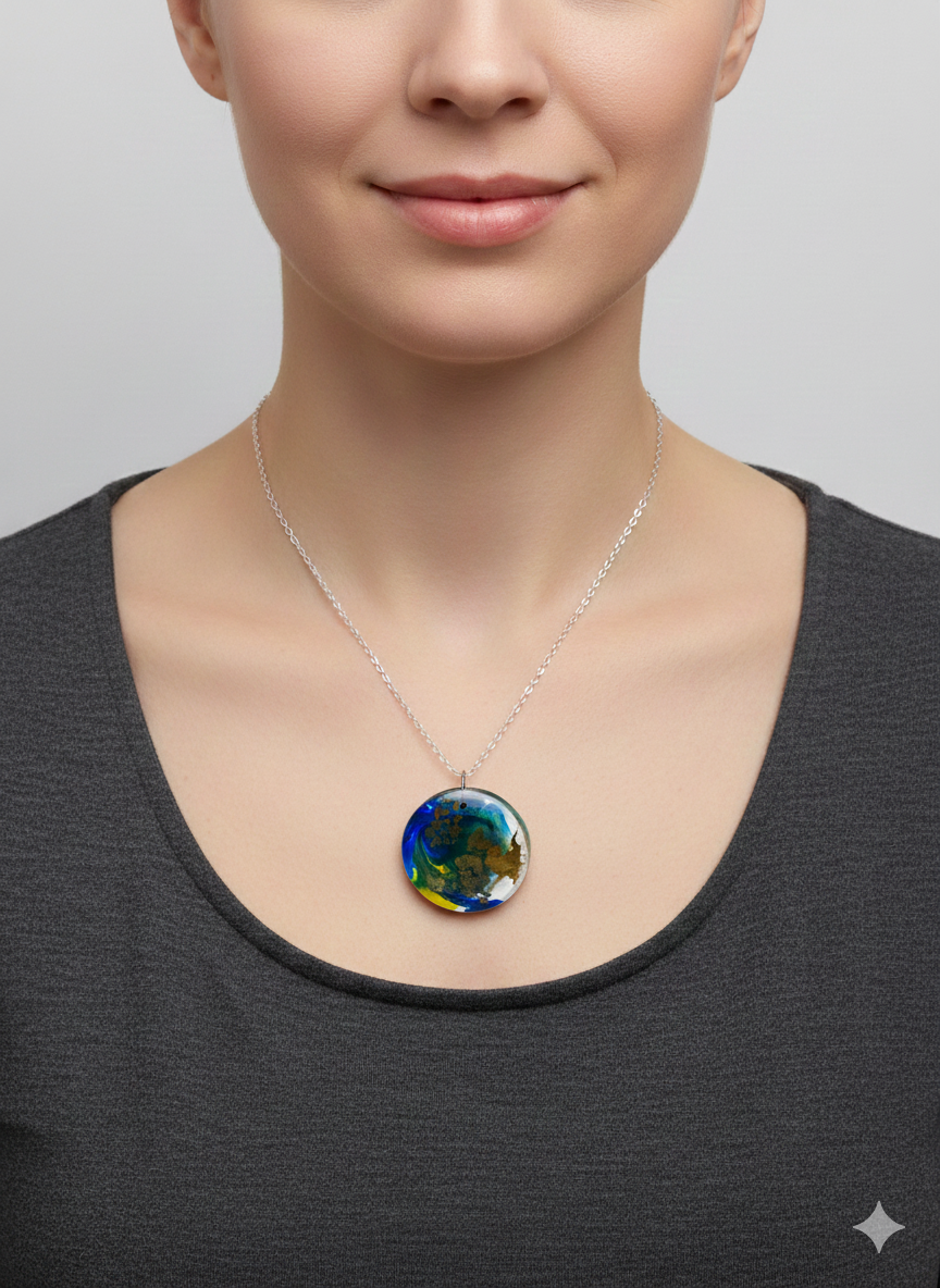 Experience the beauty of a miniature abstract world with this handcrafted resin pendant. Featuring swirling blues, greens, and rich earth tones, this unique piece hangs on a delicate metal chain, making it the perfect statement accessory or a thoughtful gift for a beloved mum.