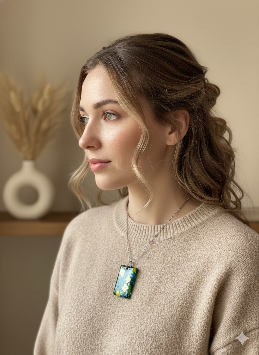 This stunning handcrafted rectangular resin pendant is a piece of wearable art celebrating colour and subtle luxury. Each piece is unique, featuring a dynamic, fluid design where luminous emerald green and vivid aqua blue pigments swirl against a background of sunny yellow. The entire composition is beautifully accented by delicate inclusions of shimmering gold-tone leaf, which catch the light and add a rich, natural texture and warmth.