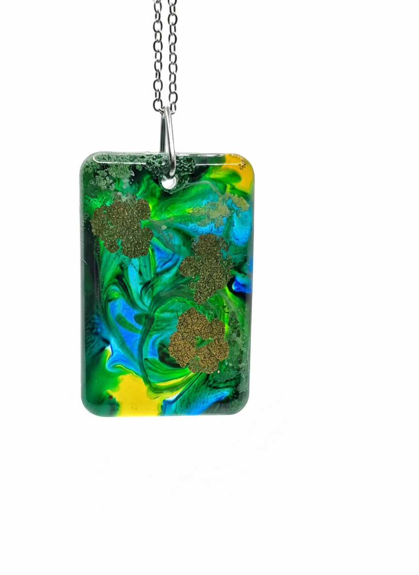 A bright, handcrafted rectangular pendant showcasing a vibrant swirl of emerald green and aqua blue, set with delicate flakes of glimmering gold-tone leaf. Suspended elegantly, this piece offers a rich, artistic pop of colour and texture.