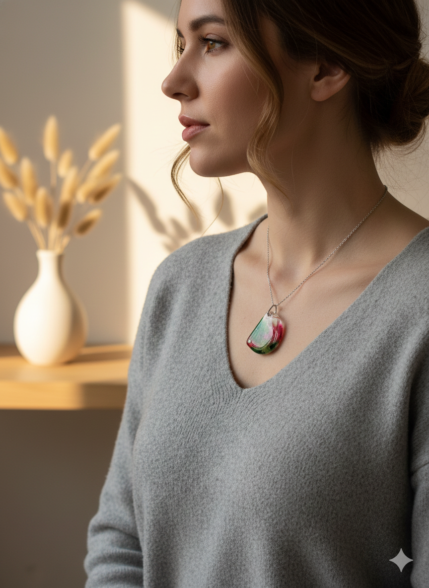 Suspended from a sleek silver-tone chain, this necklace makes a stunning statement piece. It’s an ideal accessory for those who love bold colour and modern design, or a perfect, thoughtful gift for a loved one—a beautiful gift for your mum, sister, or friend. As a handcrafted piece, you receive an exclusive, one-of-a-kind wearable treasure that elevates both casual and formal wear.
