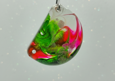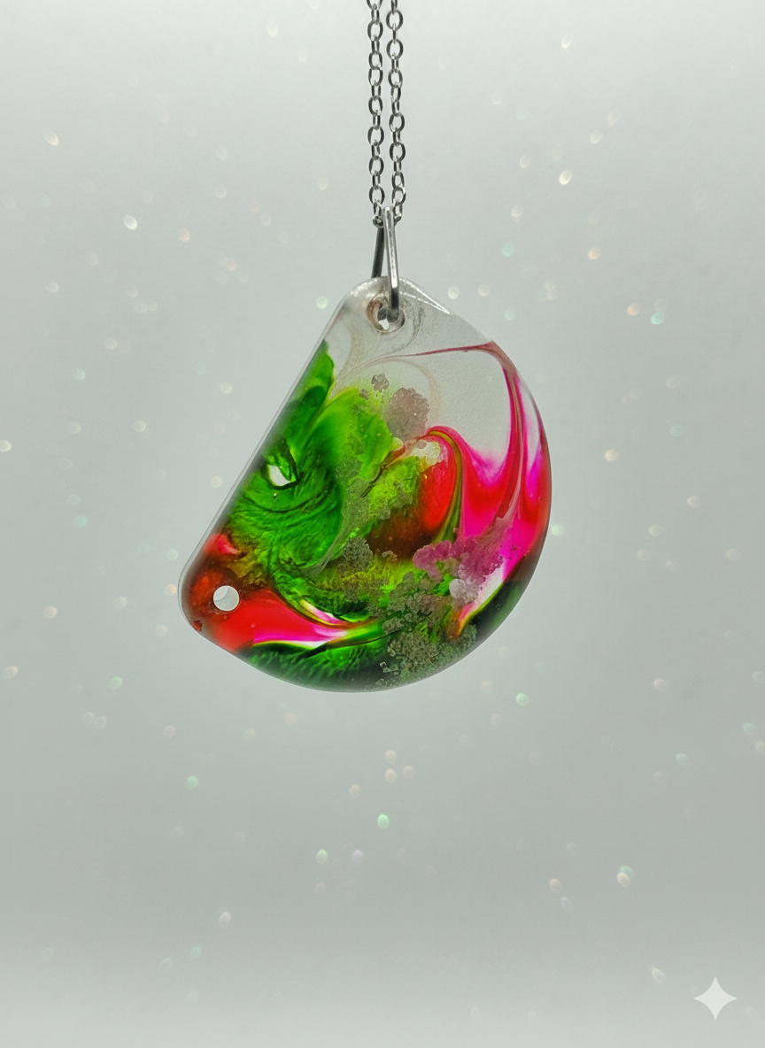 A striking, handcrafted resin pendant featuring a dynamic swirl of vibrant red, fuchsia, and luminous green, suspended from a delicate chain. This unique, contemporary accessory adds a bold splash of colour and modern elegance to any look.