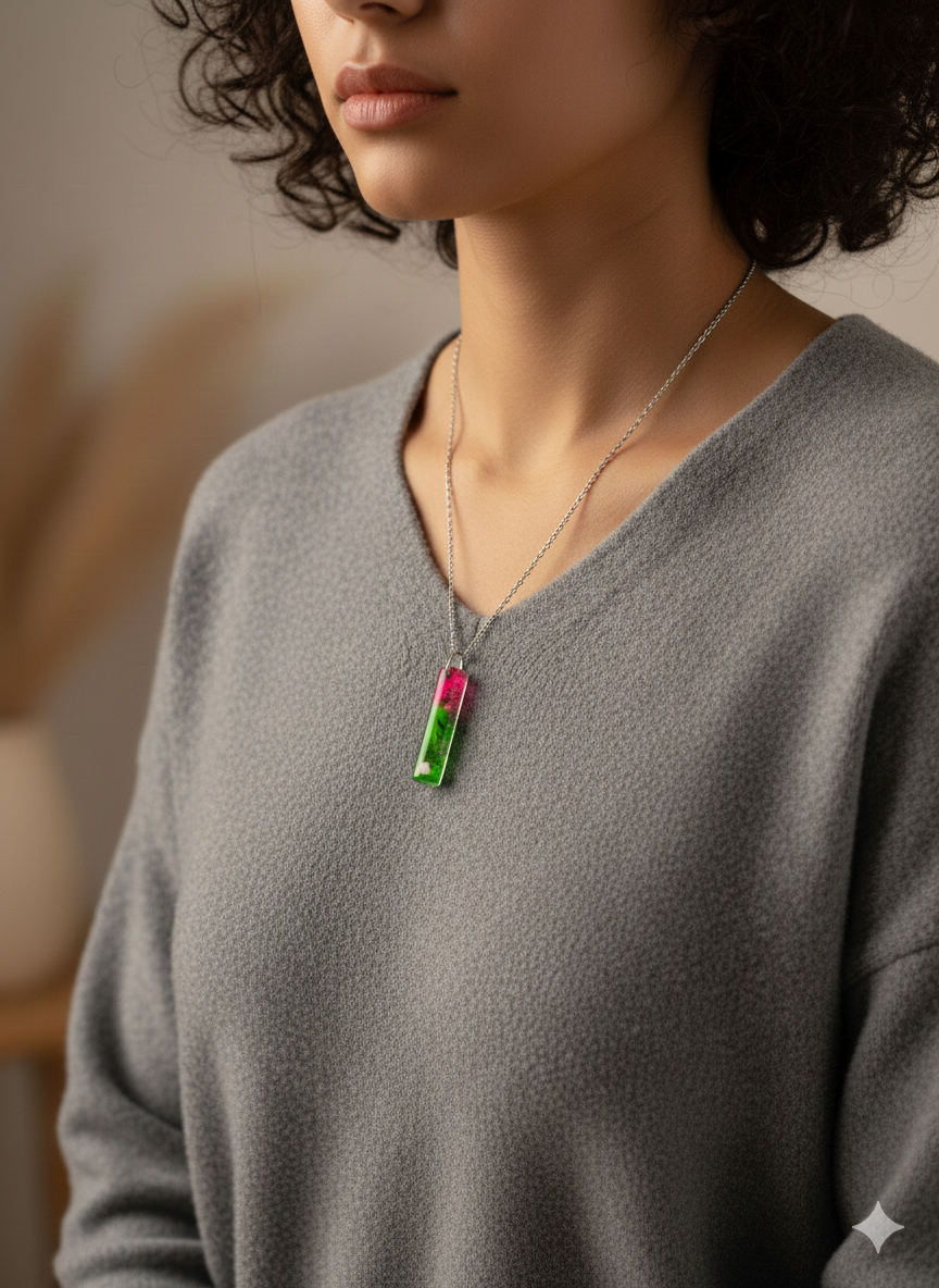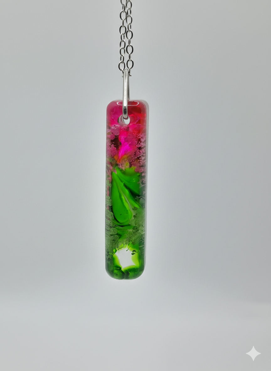 Handcrafted Slim Bar Resin Necklace: Vibrant Pink & Emerald Green Abstract