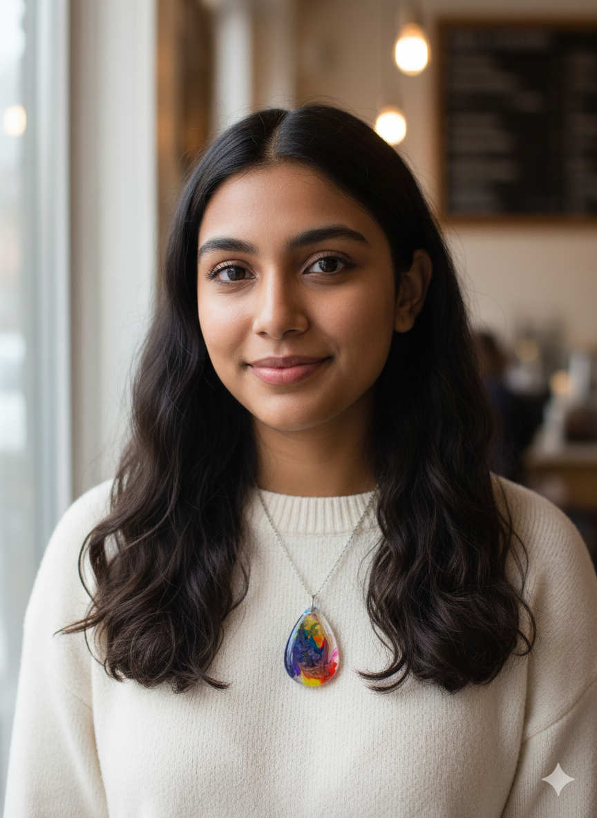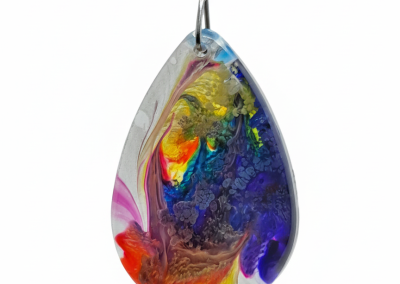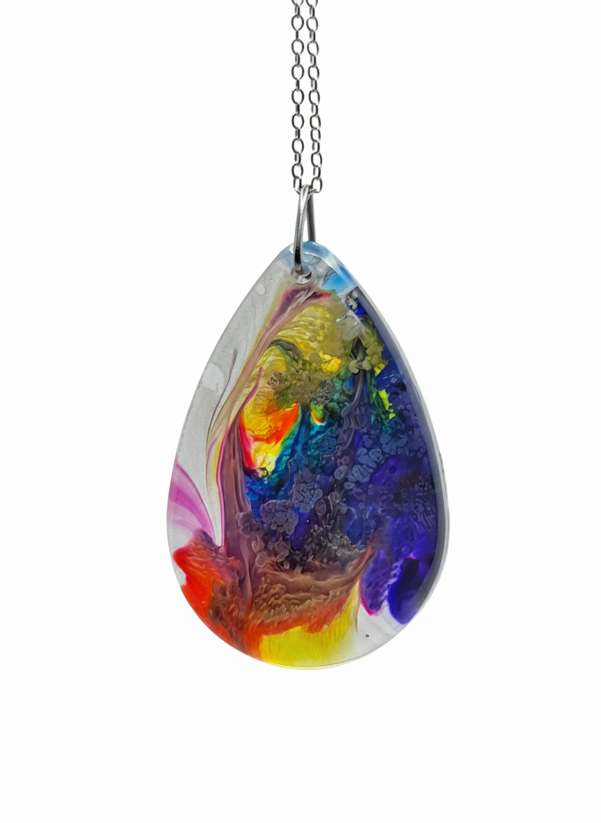 Experience the joy of colour with this unique, handcrafted teardrop pendant. It features a luminous abstract swirl of ruby red, deep blue, gold-yellow, and vibrant pink, suspended in crystal-clear resin. Suspended elegantly, this striking piece is true wearable art.
