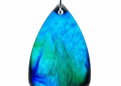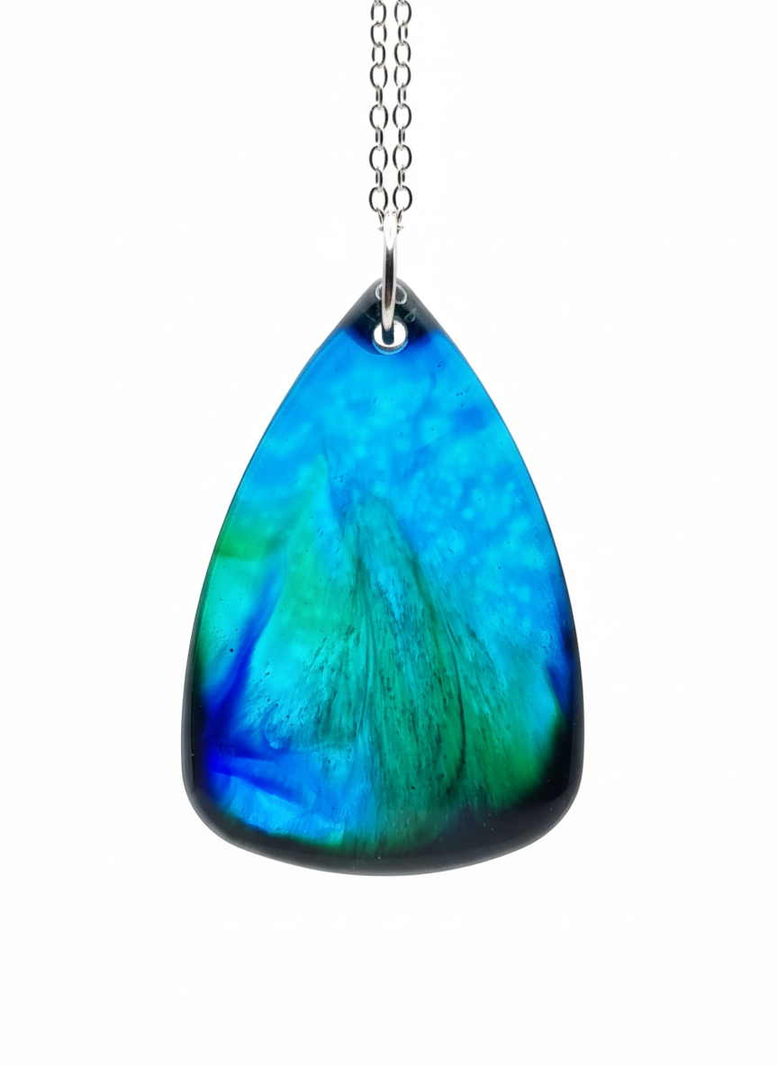 This stunning handcrafted teardrop resin pendant is a tribute to the shifting colours found in nature, like the transition from deep water to shallows. Each piece is uniquely created, showcasing a beautiful, fluid gradient where rich sapphire and aqua blues seamlessly merge into luminous emerald and seafoam greens. The depth and clarity of the resin enhance this chroma shift, giving the piece a gorgeous, almost ethereal luminescence.
