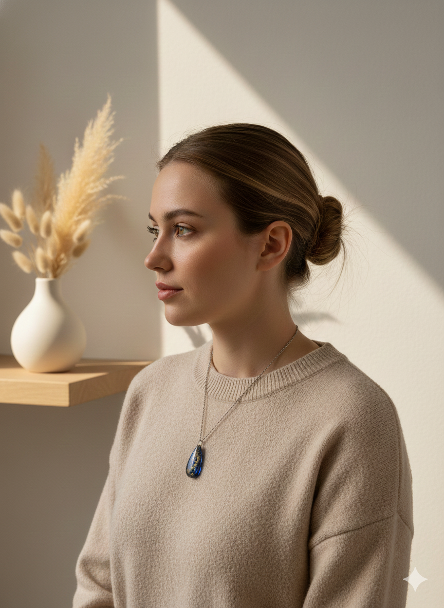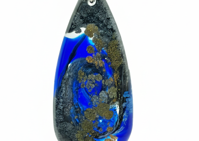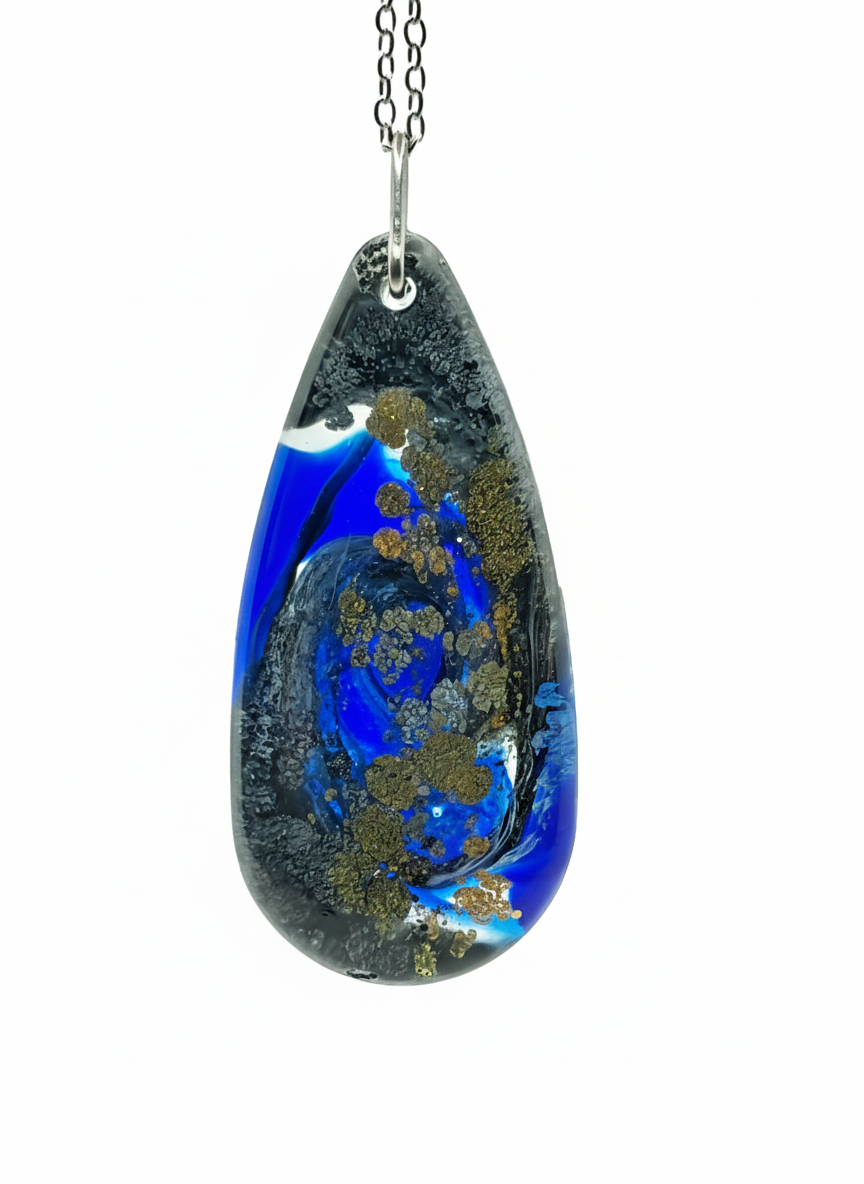 A bold and sophisticated handcrafted teardrop pendant. It captures a striking swirl of deep midnight blue and solid black, highlighted by glimmering gold-tone flakes. Suspended elegantly, this unique piece makes a luxurious, dark statement.