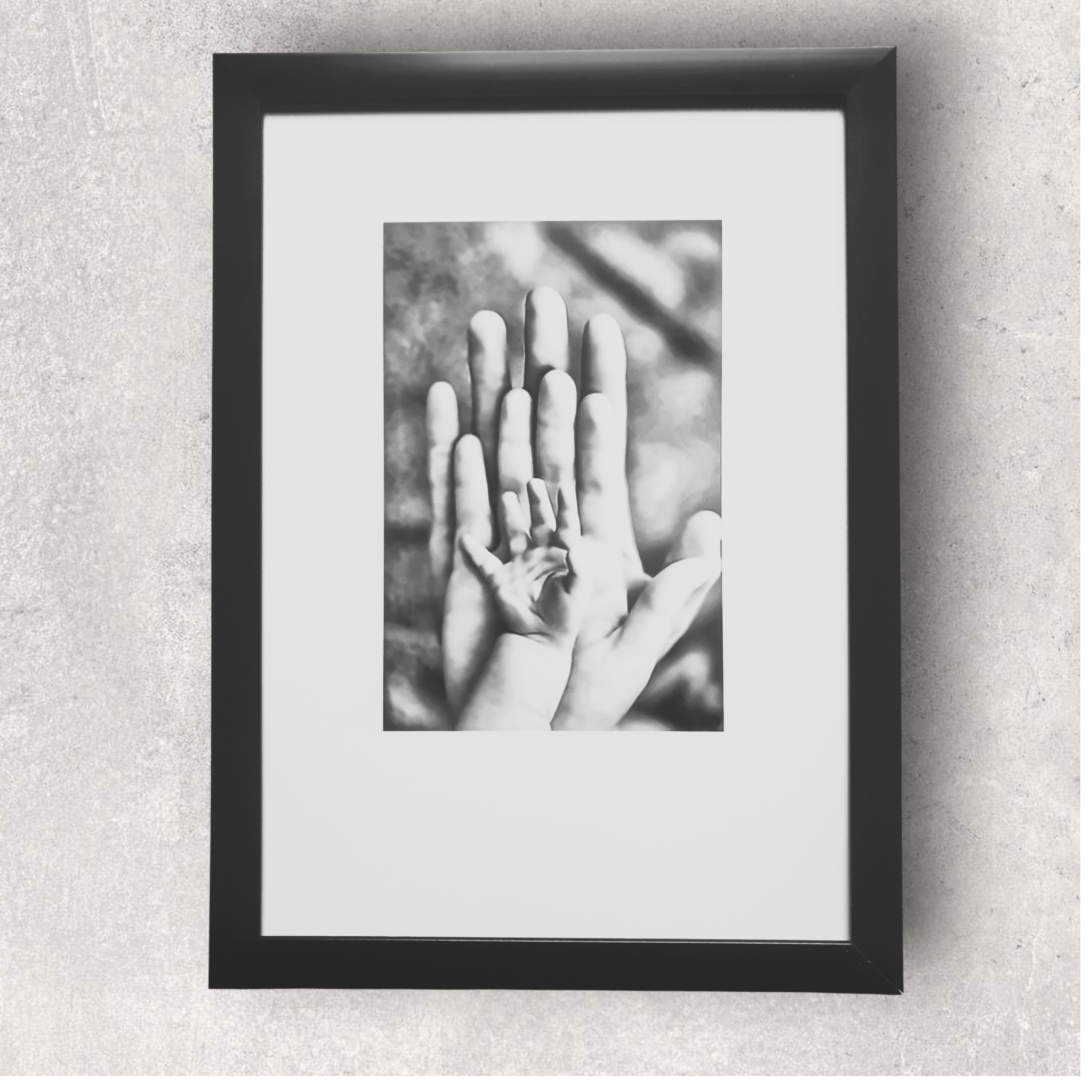 A beautifully printed A4 photograph capturing a parent’s and a baby’s hands. Presented in a sleek black frame, this print is a deeply sentimental piece of decor and a perfect gift for new parents, a partner, or a special mum.