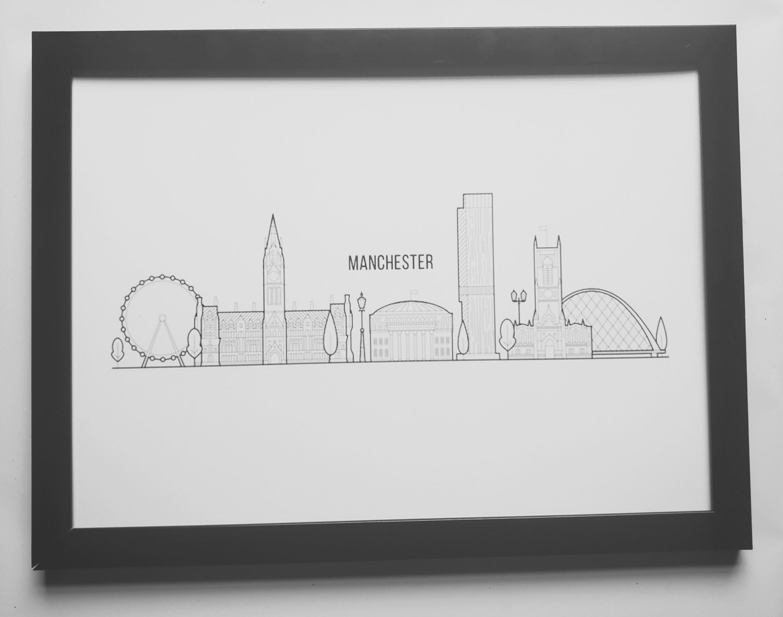 Celebrate the energy of the UK’s ‘Northern Powerhouse’ with this stylish black and white A4 line art print of the Manchester skyline. Featuring landmarks like the Beetham Tower and the Manchester Wheel, this modern, detailed piece is perfect for adding sophisticated wall decor. It comes ready-to-hang in a sleek black frame.