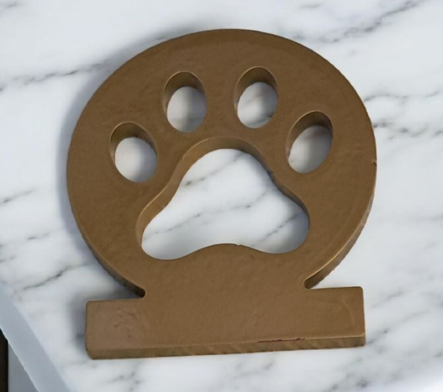 Modern Golden Paw Print Stand: This elegant, gold-toned paw print cutout is the perfect decorative accent or a heartfelt memorial keepsake for your beloved pet. Ideal for displaying small photos, signs, or standing alone on a desk or shelf.