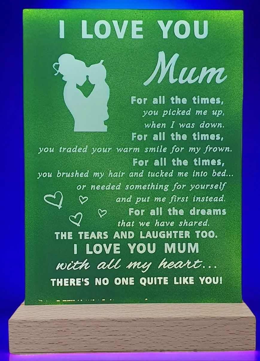A Poetic Tribute for Mum! This handmade A6 acrylic plaque features a heartfelt “I Love You Mum” poem and silhouette, beautifully illuminated by its USB-powered LED wooden base. A perfect, glowing keepsake to express your deepest gratitude.