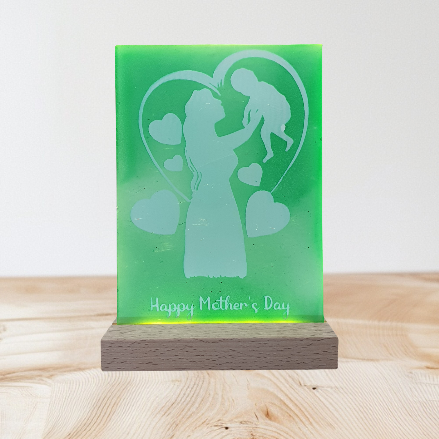 Each plaque is carefully handmade, beginning with a clear Acrylic panel. This transparent canvas is then skilfully engraved or embedded with a serene silhouette of a mother gently holding her baby, encircled by loving hearts, and featuring the sweet message “Happy Mother’s Day.” The intricate details stand out beautifully when unlit, and truly come to life with a radiant glow.