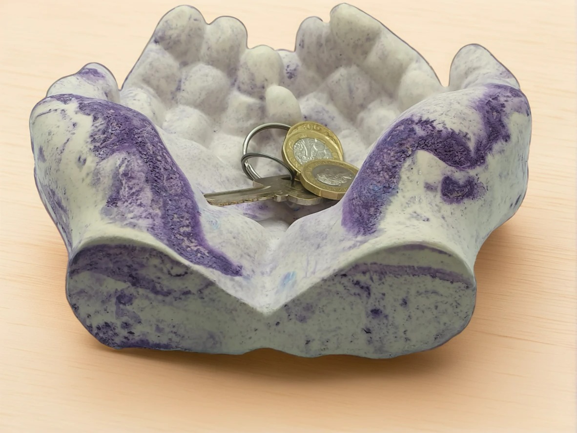 Each piece is truly artisan-made and hand-poured using high-quality, durable eco resin. The material is carefully blended to achieve a mesmerizing purple and white marbled swirl, ensuring that no two ‘hand bowls’ are exactly alike. The detailed texture of the palms and fingers offers a unique, tactile experience, while the raised design creates a secure space for small items. This distinctive sculptural form and colouring make it a memorable one-of-a-kind handmade gift or a striking addition to your own collection.