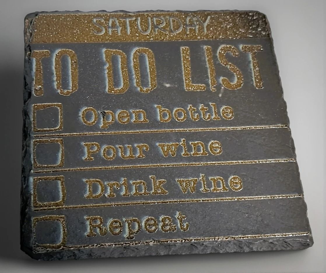 This amusing, handcrafted square natural slate coaster features the laser-engraved “Saturday To Do List” with the simple steps: Open bottle, Pour wine, Drink wine, Repeat. A unique, durable, and funny gift for wine lovers and anyone who enjoys a relaxing weekend.