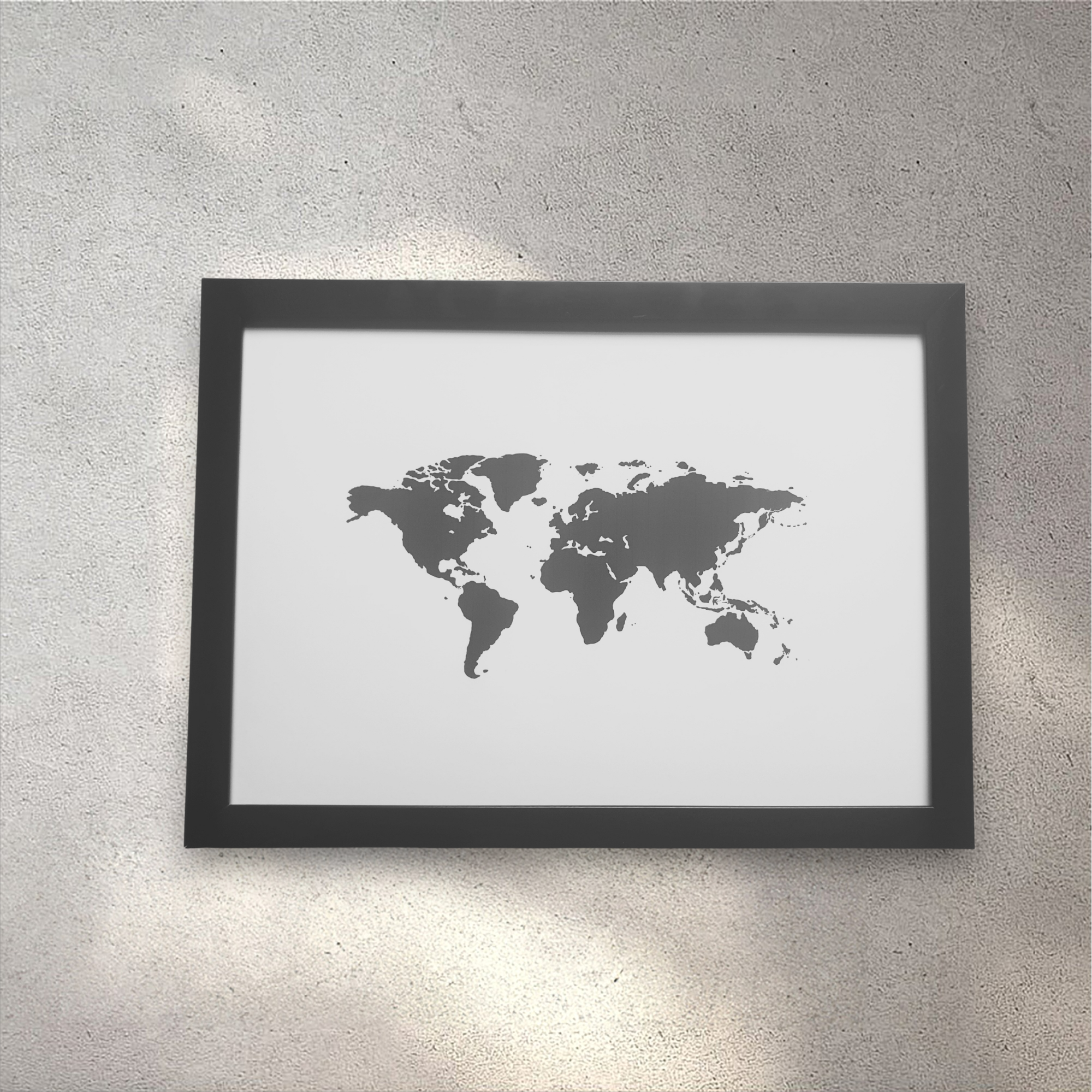 A clean, minimalist A4 print in a black frame featuring a detailed, monochrome silhouette of the World Map. Perfect for travel enthusiasts, modern minimalists, and adding a touch of global adventure to any room.
