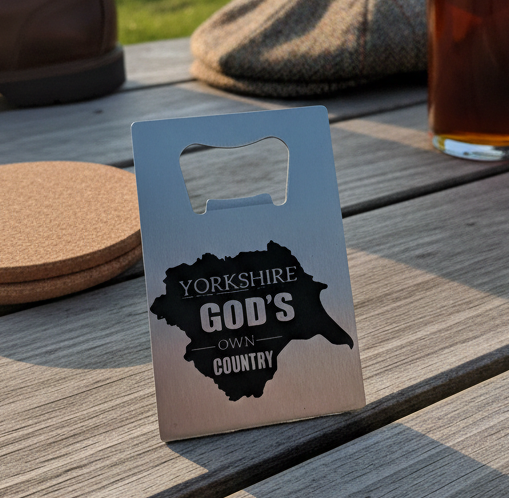 Carry the pride of the North in your pocket with this sleek, stainless steel wallet bottle opener. Featuring a laser-etched map and the iconic “God’s Own Country” slogan, this durable, slimline tool ensures you’re always ready to crack open a cold beverage.
